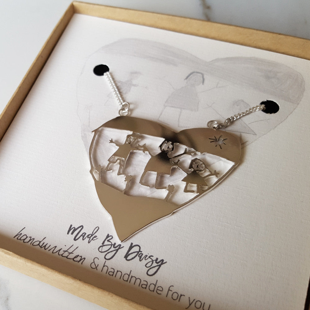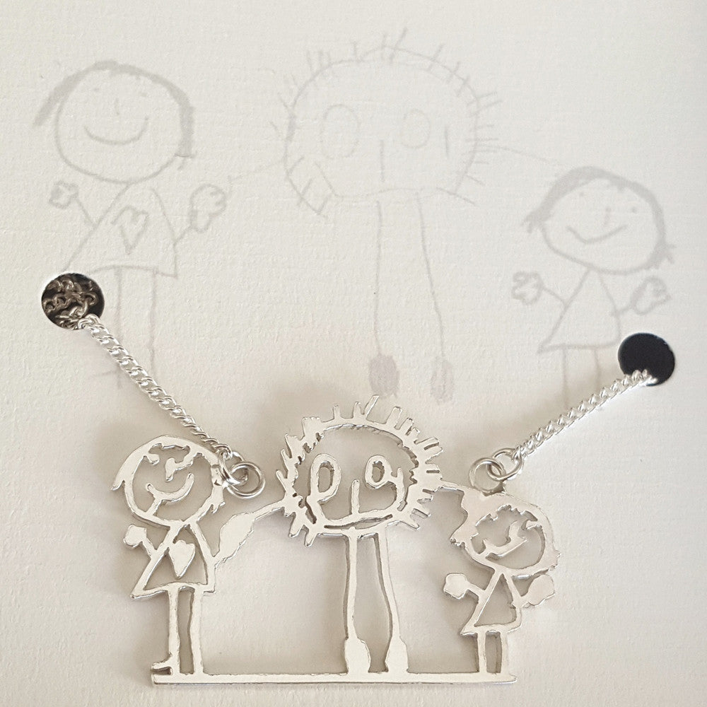 Your child’s drawing of your family handmade into a special sterling silver keepsake necklace. This listing is for two or more characters, if your drawing has just one character please see the single character listing here.
