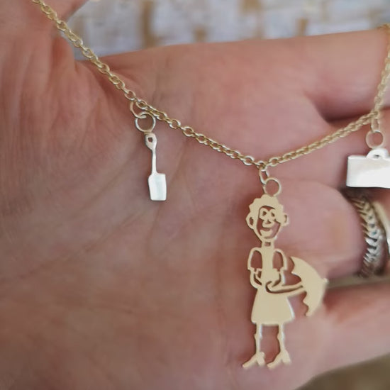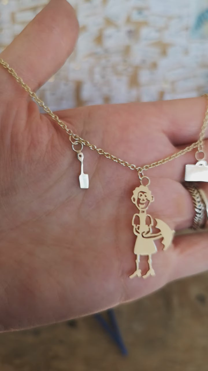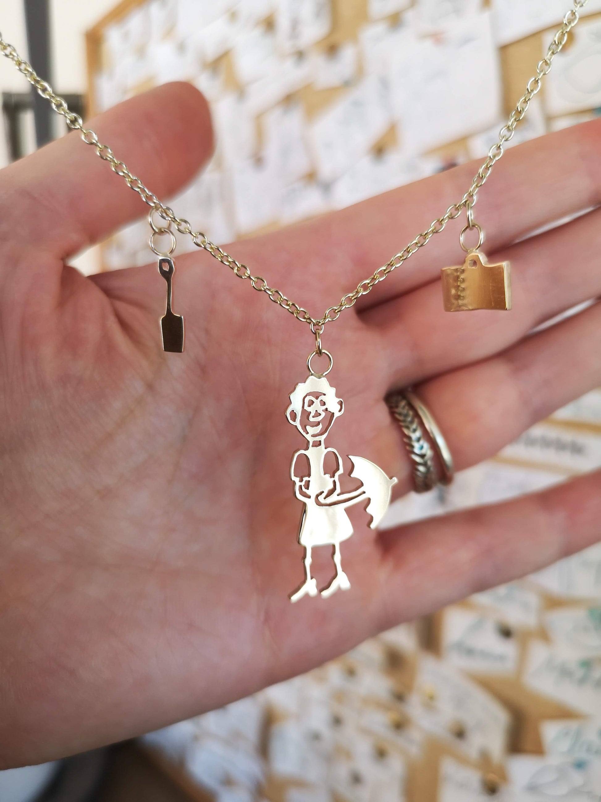 Choose to have either one single character on the necklace, or up to three smaller drawings (ie like in the photo - a character plus her two small accessories). The size of the character / small drawings will depend on the total number of drawings ordered. The largest character may be up to around 20 - 25mm, unless a larger piece is requested at an additional cost.