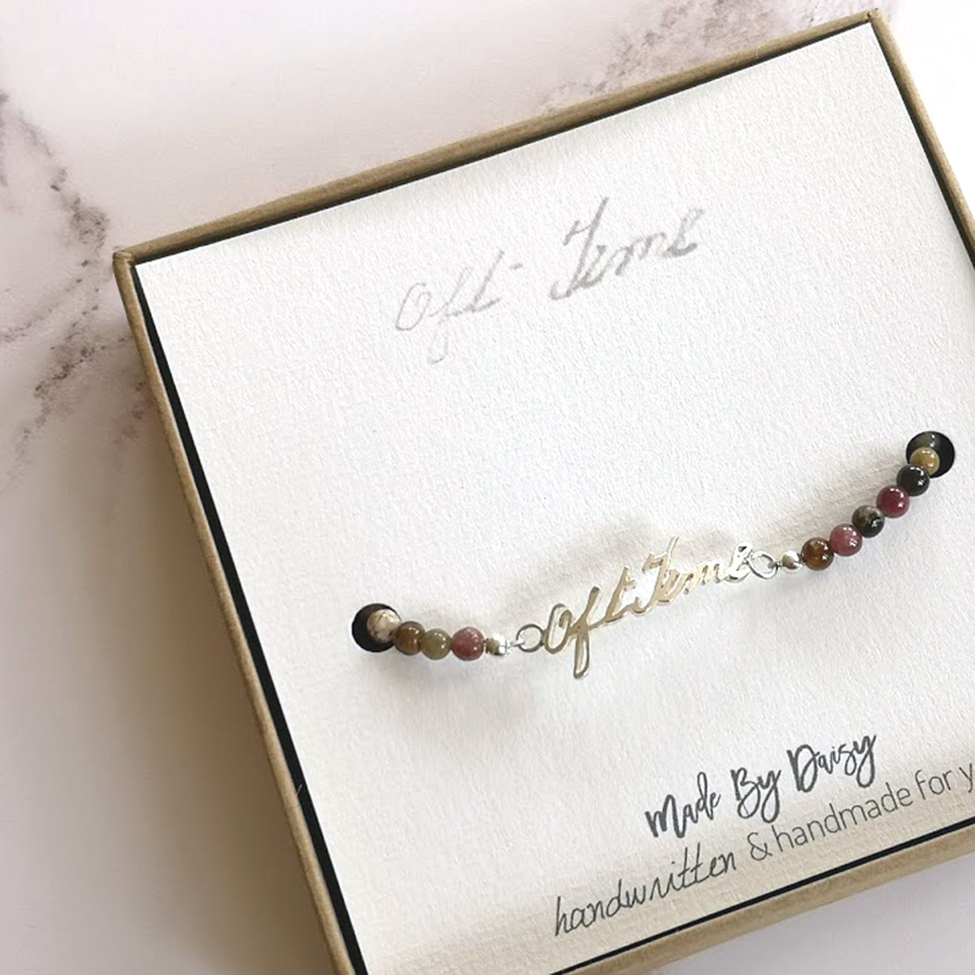 Your bracelet will come in a box with the Made By Daisy logo on the lid and a custom insert card, printed with the handwriting used to create the piece. I love to create those extra special touches to my work. You can also choose to have your order giftwrapped by checking the tick box at the checkout. I use giftwrap that I source especially from a fellow UK small business that designs and hand screen prints their own range.