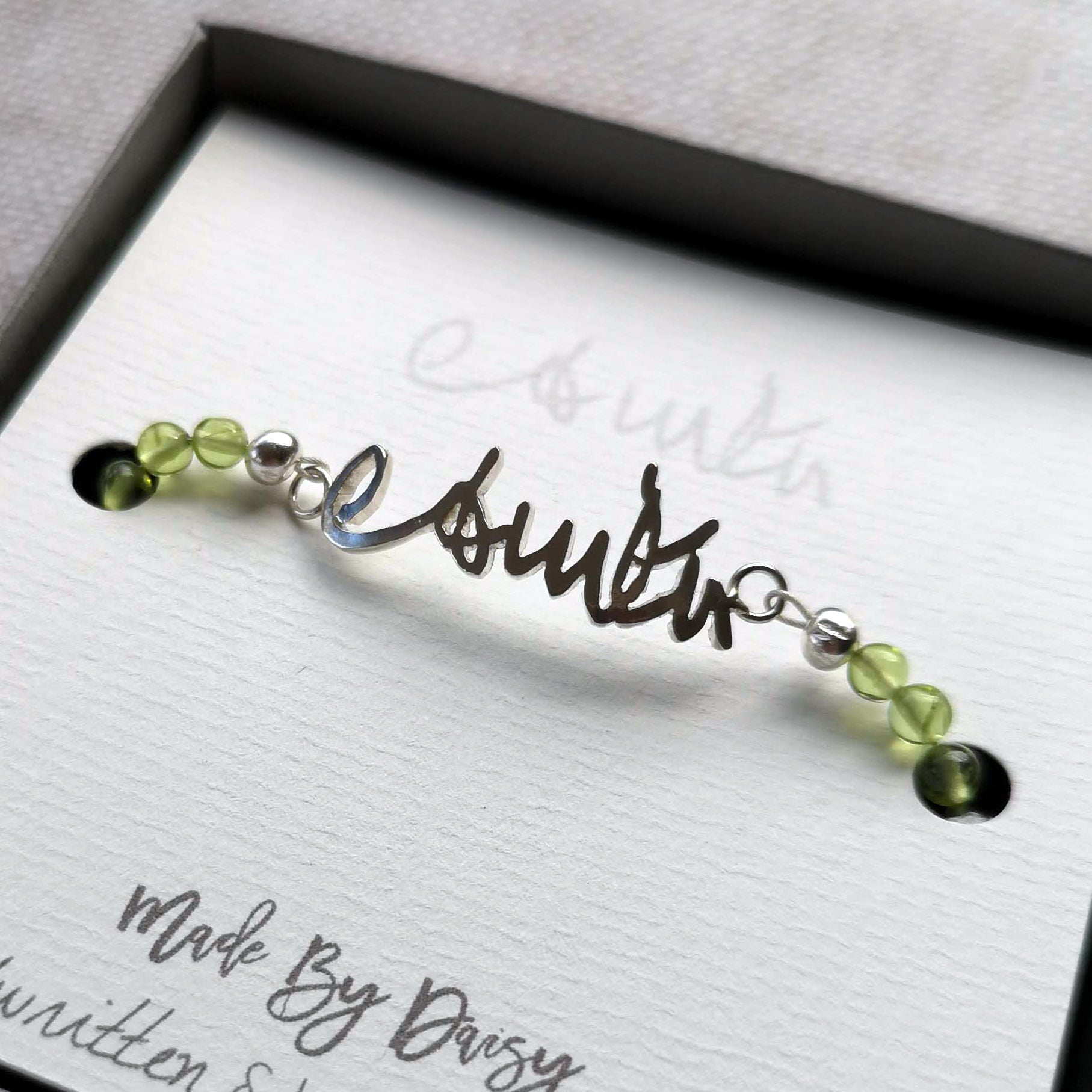 A personalised handwriting bracelet featuring pretty peridot gemstones.